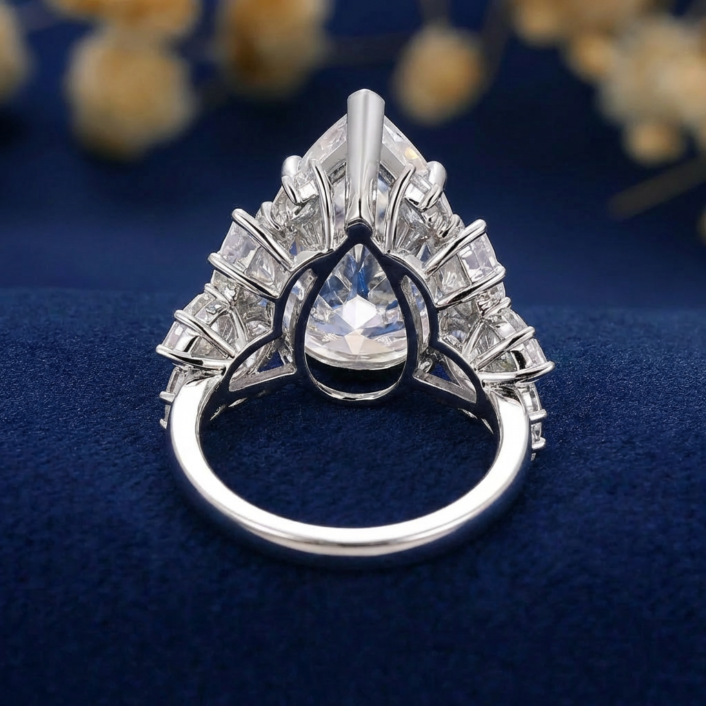 Inspired by the regal splendor of European crown jewels, this luxury engagement ring features a magnificent pear-cut Moissanite center stone secured by elegant claw prongs. A breathtaking crown of marquise-cut Moissanites radiates upward like a royal tiara, while round and pear-shaped accent stones cascade along the sides, all handcrafted in lustrous solid white gold