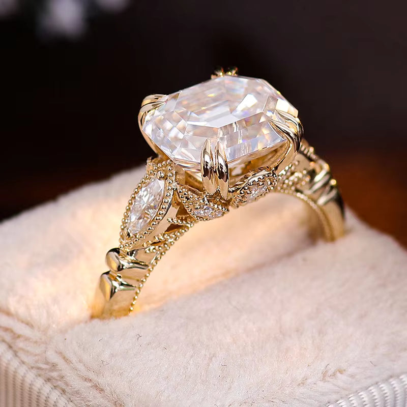Inspired by the timeless sophistication of Art Deco architecture, this exquisite engagement ring features a breathtaking emerald-cut Moissanite center stone secured by elegant artisan claw prongs. Two brilliant pear-cut Moissanite side stones add graceful symmetry, while the polished solid gold band creates a refined silhouette. GRA certified for guaranteed authenticity and quality.